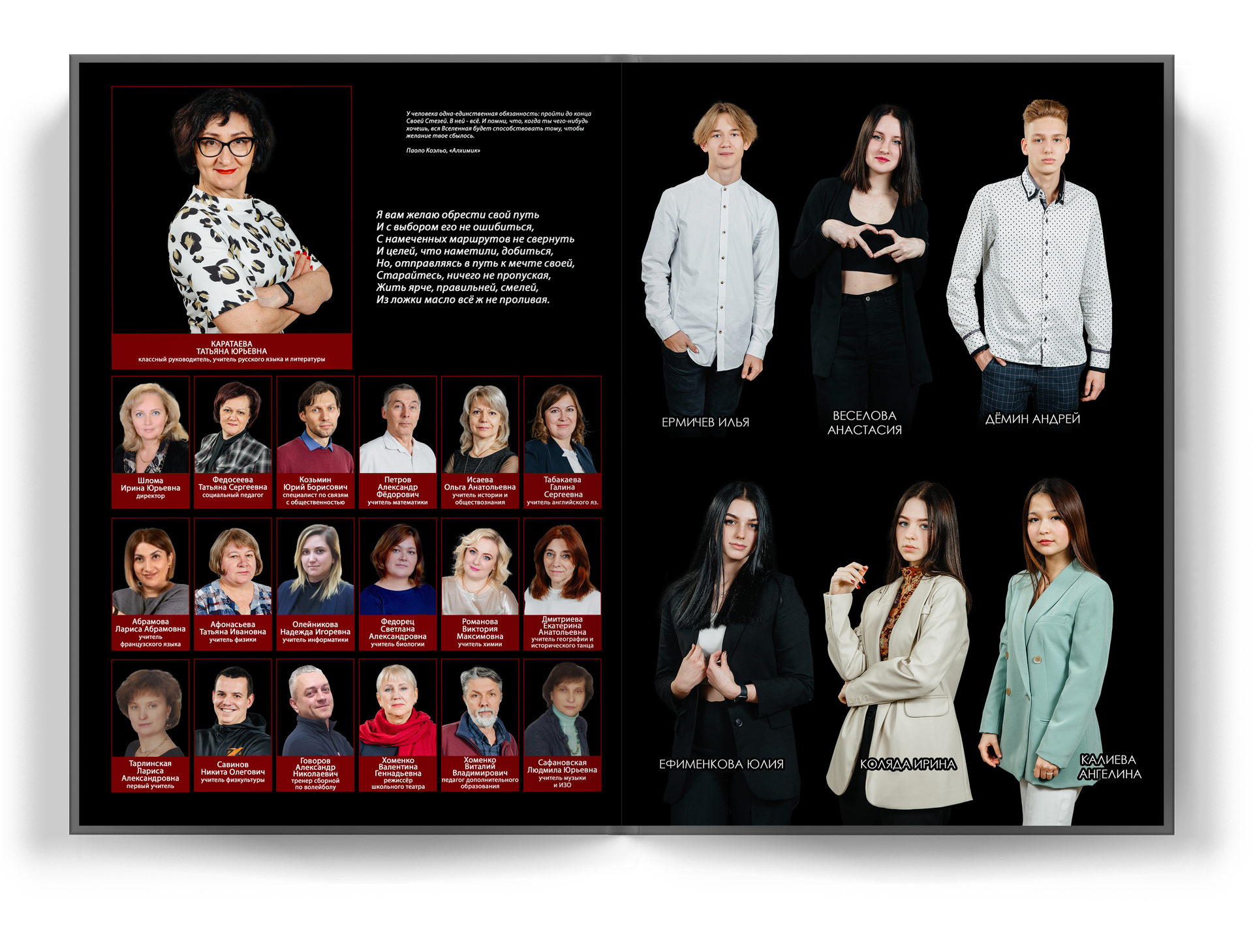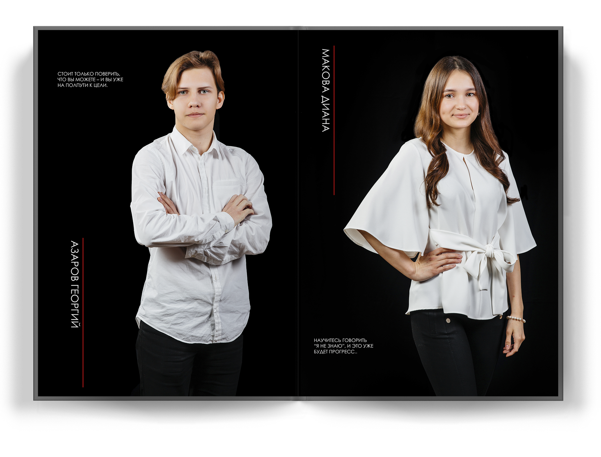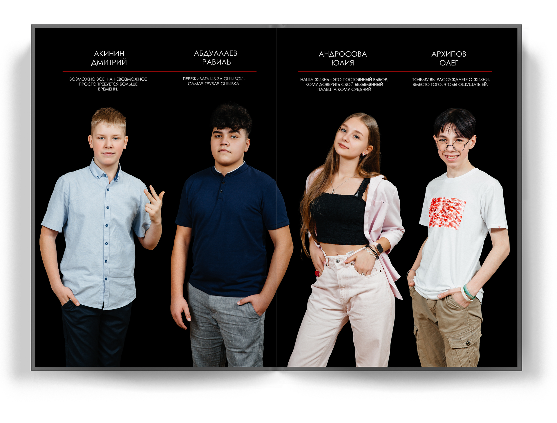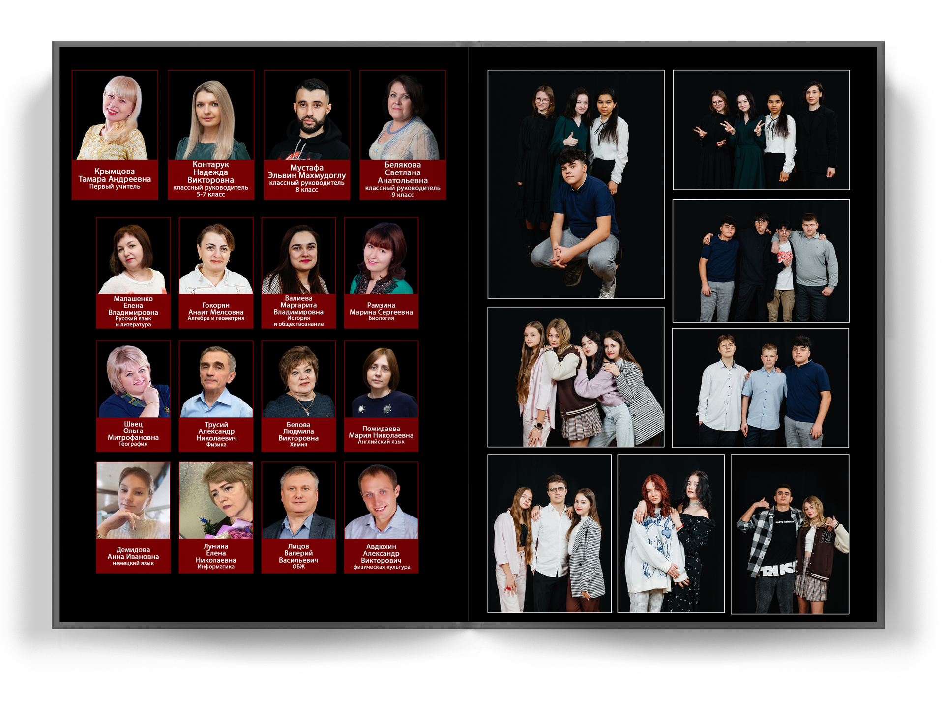 Благодаря оригинальному подходу и высокому профессионализму мастеров нашей студии, даже такие привычные места, как школьная столовая, спортзал, коридоры, кабинеты становятся оригинальными и передают атмосферу и колорит школьных будней. Акцента фотографиям для выпускного альбома 9, 11 класса добавят личные цитаты и пожелания выпускников.