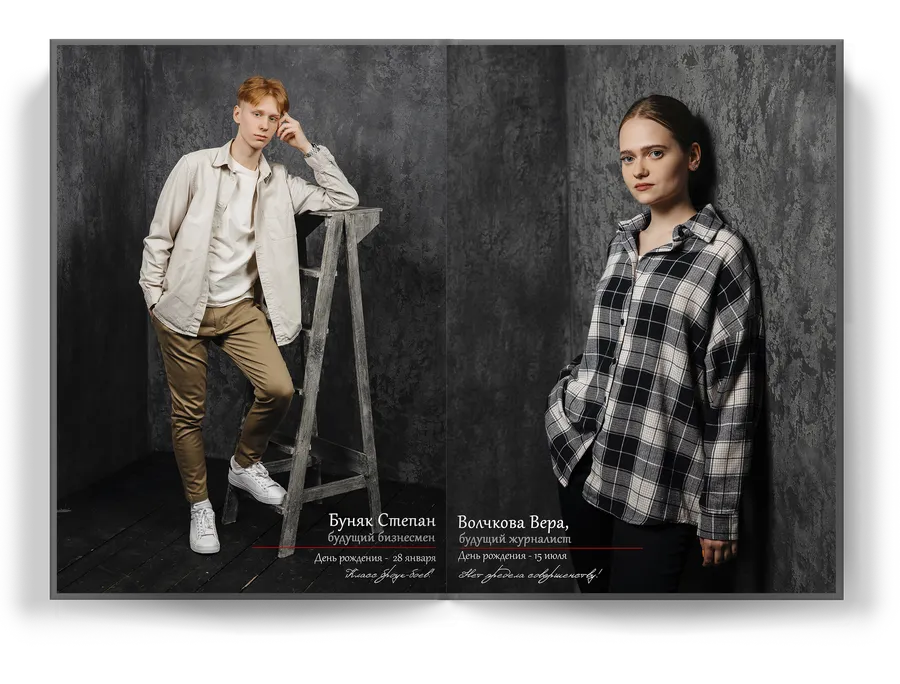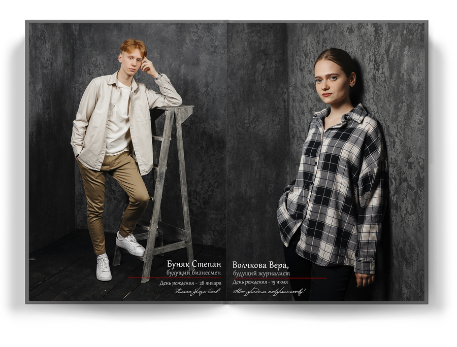 За годы работы мы собрали в своей базе много стильных студий, которые прекрасно вписываются в концепцию выпускных альбомов. Так что будьте уверены, фото получатся даже лучше, чем в школе! Проверено сотнями классов.Так же в теплое время года у вас всегда есть возможность провести съёмки в арт-пространствах и самых крутых локациях твоего города.
