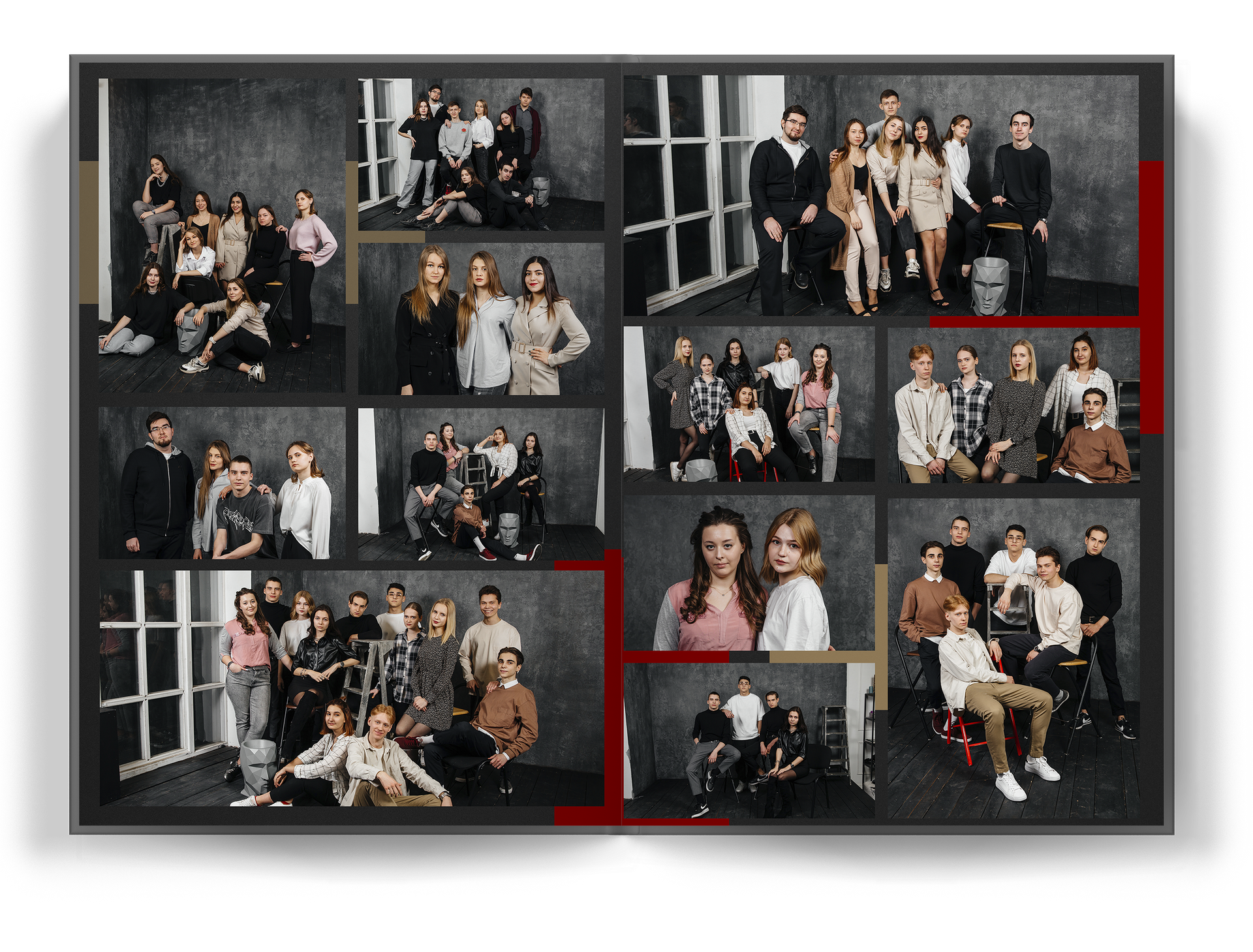 По тарифам «Всё включено» и «Exclusive» в стоимость альбома включена портретная съёмка в разных студиях вашего города. А групповая съёмка проходит в вашей школе или любой открытой локации вашего города.
